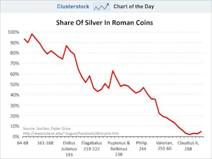 As the Roman Empire continued into its demise and inevtible collapse, so the currency was continually debased with ever more quanties of nickel. The chart below shows the silver content of the Denarious coins all the way up to the end of the Roman Empire in 268 AD. The result of the debasement resulted in a larger money supply, but the money was worth less. This results in higher inflation as time goes on. This can be seen that a typical soldier was paid 300% more in the latter years of the Roman Empire compared to the earlier years.